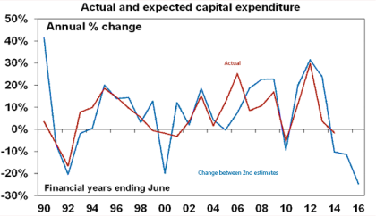 This was clear from the last ABS survey of investment intentions that was released after the RBA last cut rates back in May. Comparing the latest estimate of investment for 2015-16 with that made a year ago for 2014-15 points to a 25% fall in business investment in 2015-16 (see the next chart) and another approach points to a 23% fall.