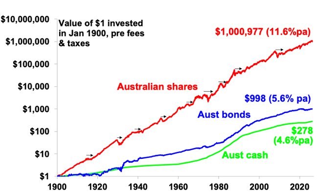 This chart shows the value of $1 invested in various Australian assets in 1900 allowing for the reinvestment of dividends & interest along the way.