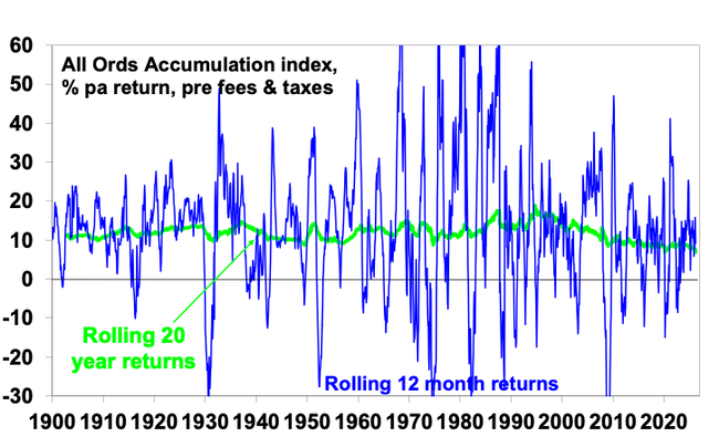 The trouble is that shares can have lots of setbacks, eg, see the arrows on the previous chart. Even annual returns are highly volatile, but longer-term returns tend to be solid and relatively smooth. Since 1900, for Australian shares roughly two years out of ten have had negative returns but there are no negative returns over rolling 20-year periods.