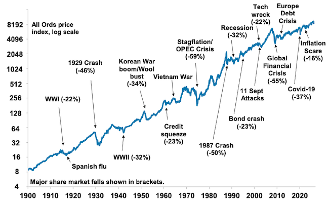 Most of the time share markets are relatively calm, but periodically they tumble and generate headlines like “billions wiped off share market.” Sometimes it ends quickly and the market heads back up again. But every so often share markets keep falling for a while. Sometimes the falls are foreseeable (usually after a run of strong gains), but rarely are they forecastable (which requires a call as to timing and magnitude). And now with the US and Israel waging War on Iran its happening again with falls gathering pace as the War drags on. From their record highs earlier this year 7%, Japanese shares have fallen 12%, Eurozone shares are down 11% and Australian shares are down 9%. While the details regarding the current plunge differ from past falls, from the point of view of basic investment principles, it’s hard to say anything new. Which is why this note may sound familiar with “5 key charts for investors to keep in mind”.